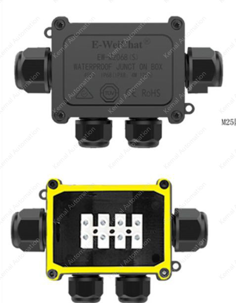 Two-way wire terminal junction box plastic waterproof junction box outdoor court light power supply IP68 waterproof boxApplication Scenario: Lighting ElectronicsDegree of protection: IP68Junction box connector size upper and lower connectors: M20; Left and right connectors: M25CharacteristicsWaterproof, dustproof, flame retardant, UV resistantWaterproof rating: IP68Voltage: 450VCurrent: 40ANumber of lines squared: 0.5-6mm²Outer wire diameter: M25: 5-9mm, 9-12mm, 10-14mmAmbient temperature: -40°C-+105°CWaterproof rating: IP68Housing material: PA66Terminal Material: Copper AlloyNo fear of high temperature nylon shell, no fear of high temperature exposure, safety and no hidden dangersAdditional loss dB: 0.1dBColor: BlackMaterial: PlasticWiring: 2 in and 2 out
