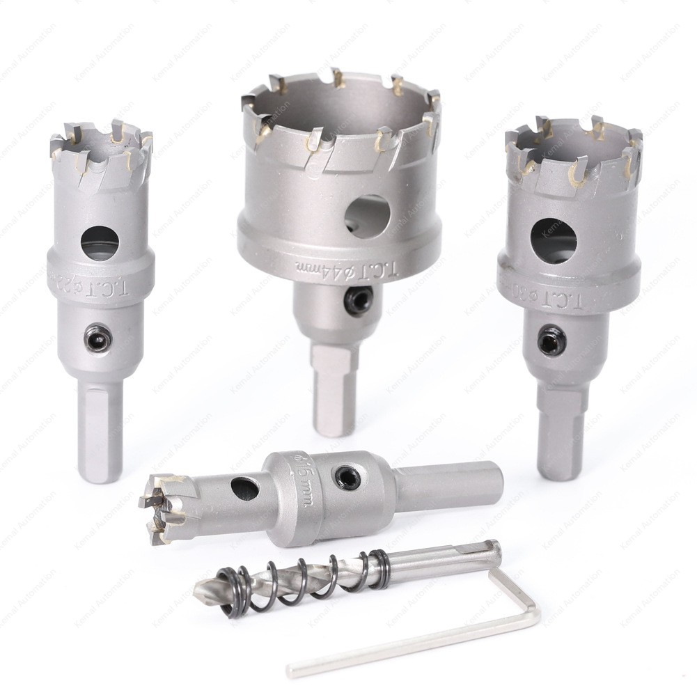 Stainless steel hole opener TCT carbide hole reamer;Maximum cutting depth: 26mm 【High Quality Materials】: This hole saw is made with high-quality tungsten carbide tip knives, which ensures its high hardness, rust resistance, and sturdiness. High-end tungsten carbide technology and optimized tooth profile structure allow the hole saw to have a superior service life and fast cutting in the most demanding applications. [Application]: These hole saw kits cut quickly and precisely into metal materials with a thickness of 28 mm, are industrial-grade metal drilling knives for stainless steel, metal, iron. It is also suitable for plastics, aluminum, FRP, etc. Remember to add coolant during continuous high-speed drilling. [Easy to use]: TCT carbide steel teeth quickly cut clean and smooth round holes. It is suitable for hand-held electric drills, vertical motor-driven drilling rigs and mobile belt magnetic drilling rigs.  【Components】: Contains drills, springs, wrenches, to make your work more convenient and easy. The pilot bit is removable.